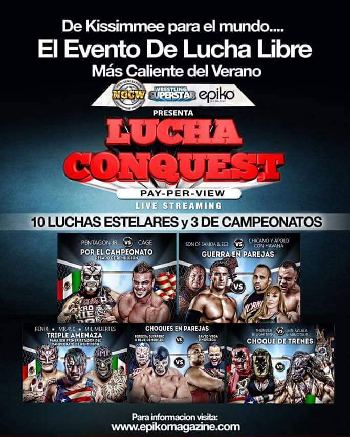 Wrestling Superstar, New Generation Championship Wrestling (NGCW) y EPIKO MAGAZINE presentan Lucha Conquest, este sábado 29 de julio a las 8:00pm, en el Florida Fire Frogs Stadium en Kissimmee, FL, USA, en una producción de Hugo Savinovich “En Español NADIE Lo Hace Mejor”.