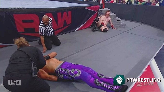 El mexicano luego se quedó en el suelo sin mucho movimiento mientras el árbitro lo verificaba y Sheamus a su vez permaneció al lado mirando.