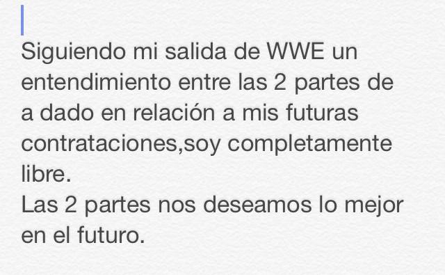 Alberto Rodriguez *Del Rio) anuncio via Twitter que llego a un acuerdo con la WWE en la que acordaron que el luchador no hablaró mal de la empresa públicamente. A cambio, WWE dejó en complete libertad a luchador y este podrá ver acción en los Estados Unidos si así lo desea.