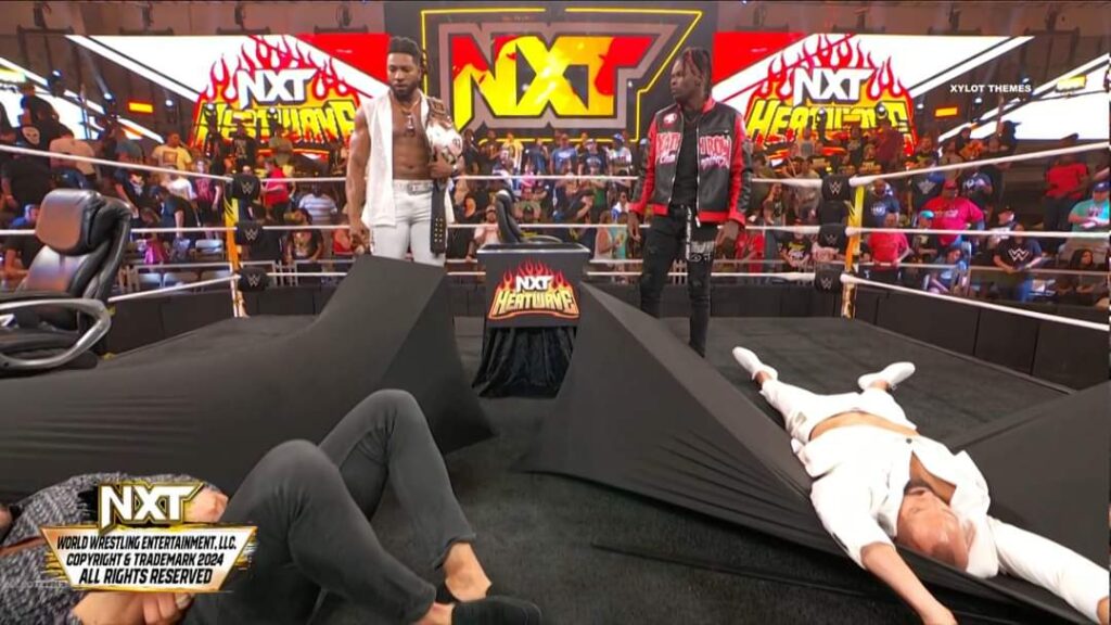 Shawn Spears, Ethan Page y Je’Von Evans esperan a Trick Williams en el centro del ring. El Campeón hace su entrada para tomar asiento junto a Page. Éste reconoce que Trick es lo más “hot” de WWE en la actualidad. Es algo que ya ha visto con anterioridad, concretamente en NXT Battleground, un evento donde tendría que haberlo vencido. “Pero no ganaste”, lo interrumpe un sonriente Williams. Page continúa, dejándole claro que este domingo no será igual que la noche el Las Vegas. Esta vez no necesita vencerlo para ganar. “Podría vencerte, pero simplemente no necesito hacerlo”, afirma “All Ego”. Trick toma la palabra, asegurando que sabe muy bien lo que está en juego. Reconoce que está contra la pared, pero es algo a lo que está acostumbrado. Él atraviesa esas paredes para triunfar. Williams admite que tal vez no tenga suficiente experiencia como campeón, pero es quien porta el título, y lo hace con orgullo. Trick promete que este domingo volverá a vencer para añadir una nueva victoria a su libro de registros. Turno para Spears, quien se burla de Trick. “Te gusta el sonido de tu voz, ¿verdad?”, pregunta. Shawn pide a Williams que siga siendo tan emocional. Son esas emociones las que le permitieron vencerle la semana pasada, y serán las que le permitan vencer una vez más en Heatwave. En cuanto a Je’Von Evans, está convencido de que no tiene ninguna oportunidad, pero al menos estará contento con la experiencia. Evans toma la palabra, señalando que todos usan su corta edad en su contra. ¿Está nervioso? Claro que sí. Pero también emocionado. Je’Von promete que en NXT Heatwave hará saber a todos quién es. Sin embargo, de lo que se está hablando es de experiencia. “Hey, Shawn, ¿por qué no le cuentas a todos cuánta experincia tienes como Campeón de NXT?”, pregunta. El público reacciona. “Ninguna”, responde el propio Evans para seguir burlándose de él. Je’Von promete que saldrá victorioso del PLE y podrá demostrarle cómo luce un campeón. Shawn se pone en pie para depositar el contrato en la mesa de Trick y Page. Ethan no tarda en firmarlo. Page se dirige una vez más a Trick, recordándole que tanto él como Spears han derrotado a Evans. La pregunta es, ¿podrá el campeón? Trick elogia a Je’Von, asegurando que le cae muy bien. Sin embargo, ni él ni sus otros dos rivales podrán vencerlo en Heatwave. Ethan, por su parte, señala que venció a Evans y Spears, y que volverá a hacerlo para ganar el título. Je’Von se pone en pie. Evans se dirige directamente a Trick, señalando que le cae muy bien. Sin embargo, ni el campeón ni los dos idiotas que los acompañan podrán hacer nada para evitar su victoria en el PLE. Cansado de hablar, Spears decide atacar a Evans. Page y Trick inician su propia pelea. Williams y Evans lanzan a sus oponentes contra las mesas del ring, que quedan destrozadas. Trick recoge su título del podio mientras Je’Von no deja de observarlo. El episodio llega a su fin con los faces en pie.