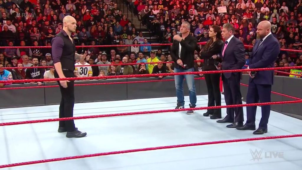 Corbin se quejó de lo que pasó con Braun Strowman anoche. Triple H le preguntó a Corbin si estaba allí para recuperar su trabajo de GM. Corbin hizo su caso. Todos dijeron que no inicialmente, pero Vince tuvo una idea. Corbin podría convertirse en el GM permanente de Raw si puede vencer a Kurt Angle ahora.