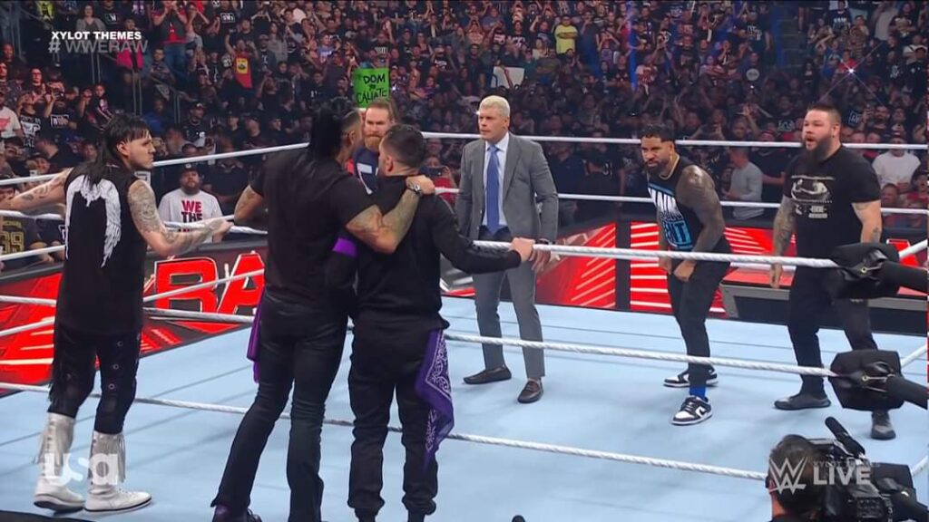 Después de un repaso a lo acontecido la semana pasada en el combate estelar de RAW, ‘The American Nightmare’ comienza a hablar sobre Jey Uso diciendo que su llegada a RAW significa que alguien debe ser traspasado a SmackDown. Rhodes comenta que él y Jey no son mejores amigos y asegura que tomó la mejor decisión: recusar a The Judgment Day. Cody llamada a esta facción como la más tóxica de todos los tiempos. Dominik, Finn Bálor y Damian Priest interrumpen y se aproximan al ring. Priest dice que la semana pasada tuvo que salir a ayudar a Jey Uso porque siempre todo tiene que girar a su alrededor. Dominik, siendo abucheado, intenta hablar, pero el público no le deja. Cody recuerda que ni la verdadera familia de Dominik lo apoya y también menciona que los tres defienden sus títulos esta noche y se pregunta qué pasaría si Rhea Ripley vuelve y ve que ninguno de ellos tiene sus campeonatos. Priest, Bálor y Dominik se preparan para atacar a Cody, pero aparece Jey Uso para colocarse a su lado. Aún así, los miembros de The Judgment Day son mayoría y siguen con el plan de ir al ring, pero Kevin Owens y Sami Zayn se unen a Rhodes y Jey, lo que hace que The Judgment Day retroceda. Sin embargo, JD McDonagh sale con dos sillas y todos van al ring para atacar a Cody, Jey, Sami y Kevin, pero Damian Priest no parece muy contento con la decisión y termina yendo más tarde que el resto. Finalmente, The Judgment Day se lleva una paliza y tienen que abandonar el ring.