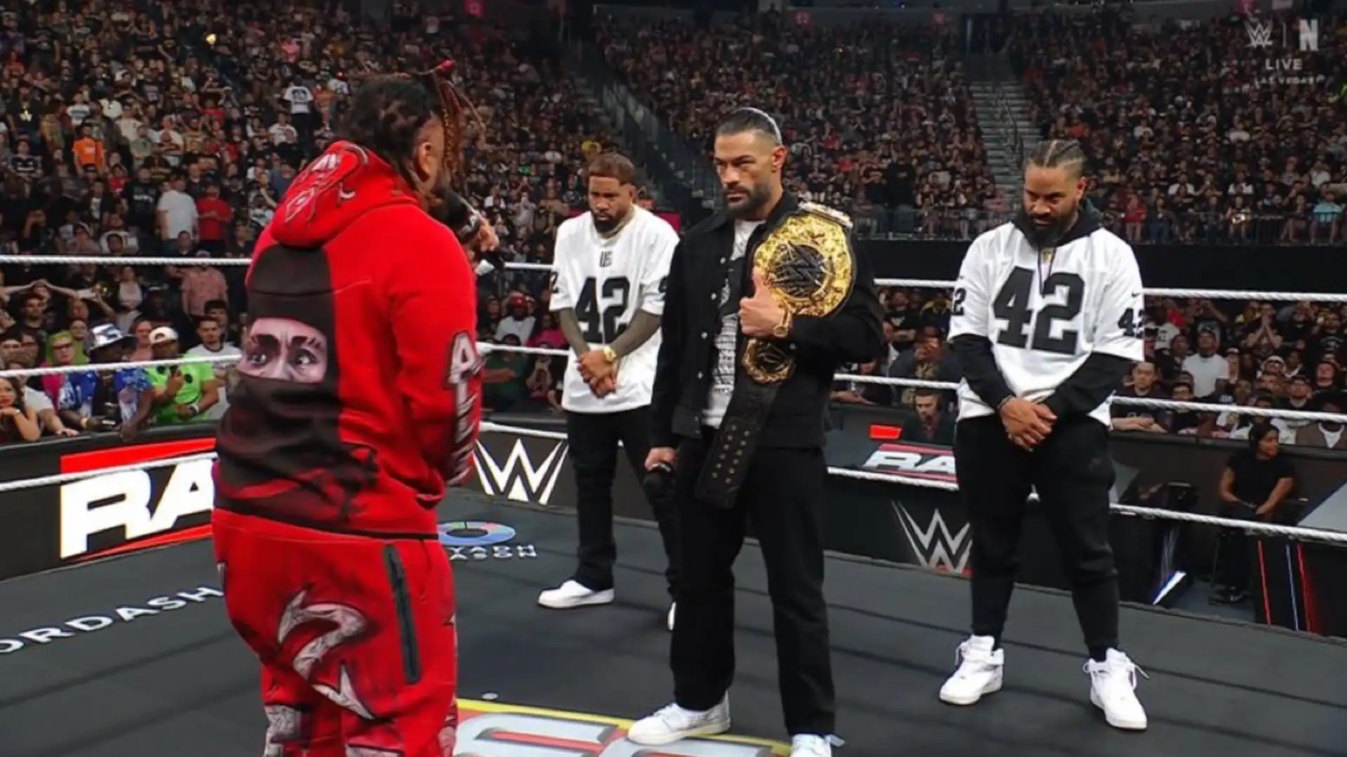 Reigns está acompañado por los Usos y recibe una lluvia de cánticos de “OTC” en el ring.