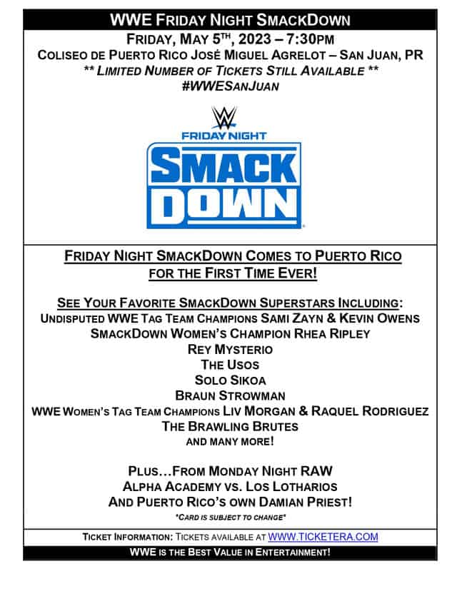 WWE actualizó el documento promocional de WWE Smackdown y WWE Backlash en Puerto Rico.