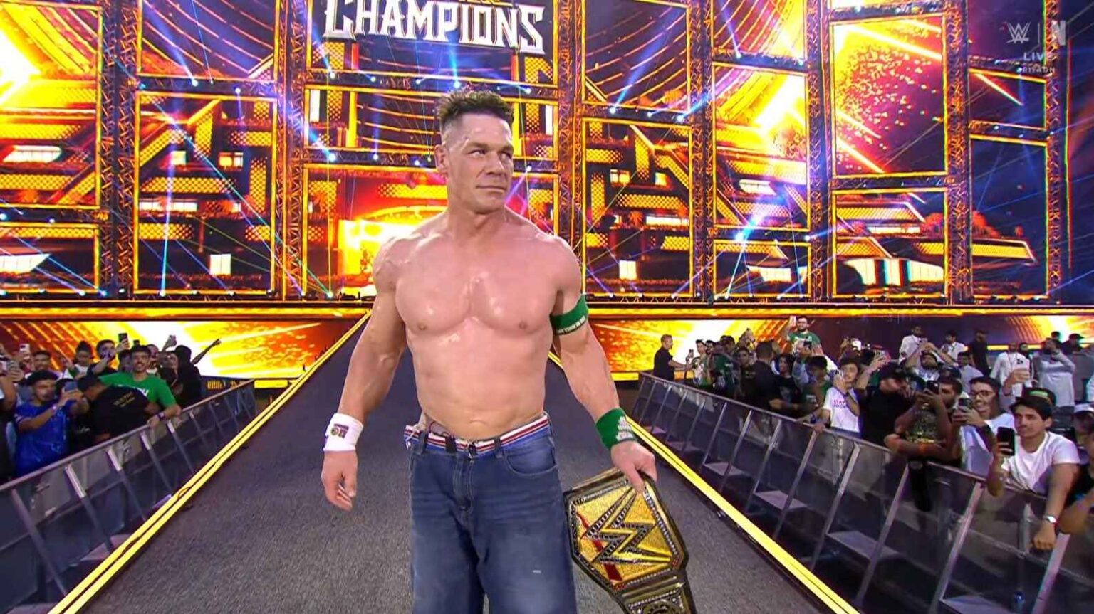 Post-lucha: Cena sonrió, posó con el cinturón y cerró el show.